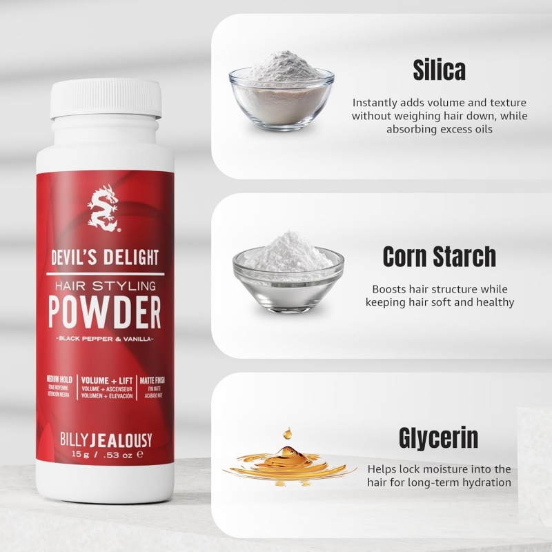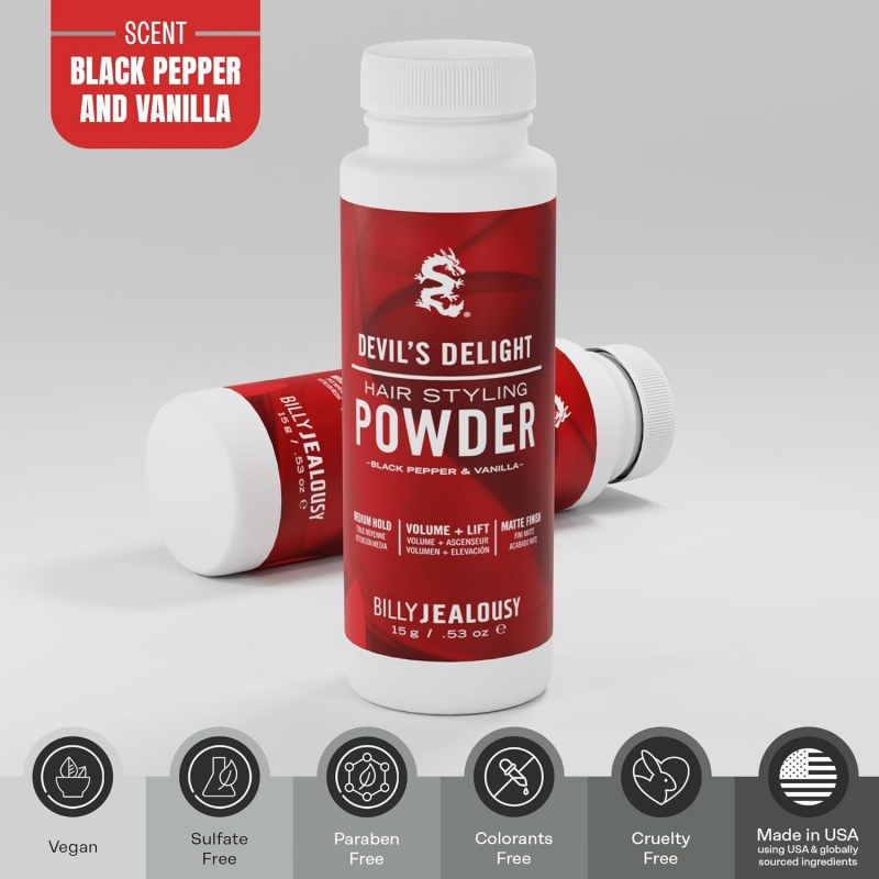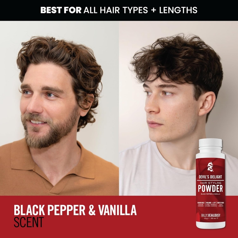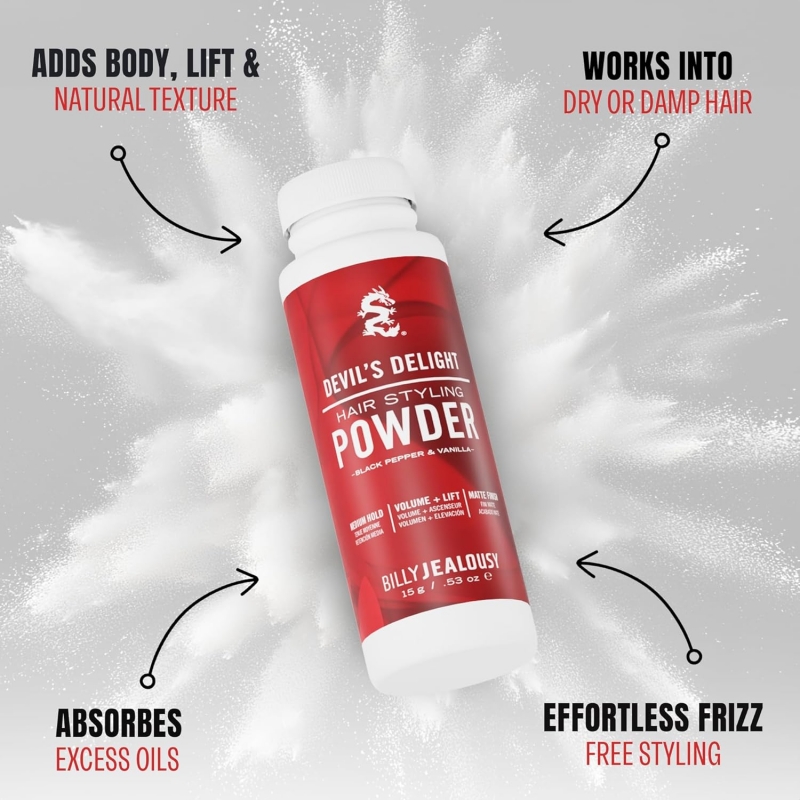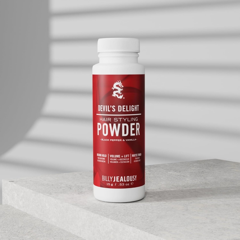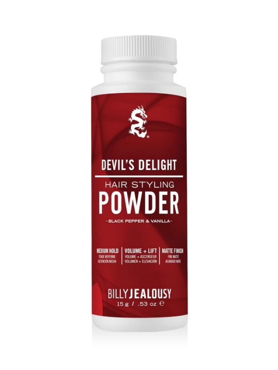 Unleash effortless volume and style with Billy Jealousy Devil’s Delight Styling Powder. This fine, weightless powder instantly adds lift, texture, and fullness for a natural, “no-product” matte finish. The formula absorbs excess oil to keep your hair fresh and reworkable all day without clumping or stiffness. Ideal for men who prefer natural volume with control and flexibility. Infused with the bold scent of black pepper and vanilla, Devil’s Delight keeps your hair feeling soft, touchable, and irresistibly stylish — perfect for daily grooming or last-minute touch-ups.